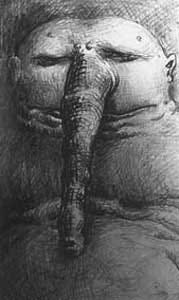 Half-born Siamese-twins are common, reaching out through dErO flesh. If intelligent, these are usually trepanned and lobotomised, (no dErO would trust even their flesh-twin). Twitching open teratomas dot the body, hair and teeth within.