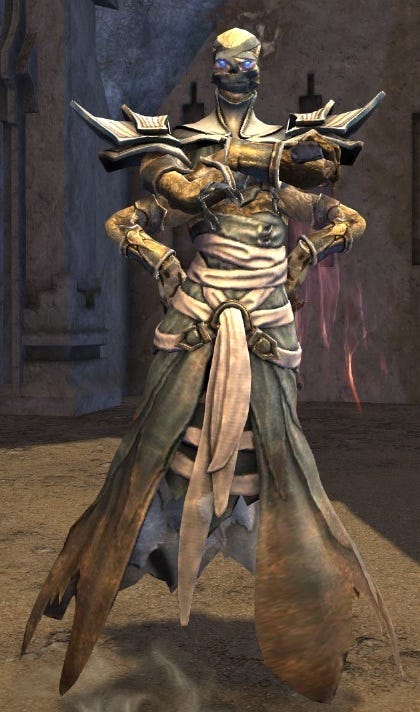 6. A metal articulated robe discards a trail of scrolls as it scrapes a furrow behind her thundering boots. Lackeys pick and continually re-archive her forgotten plans in the robe’s metallic folds.