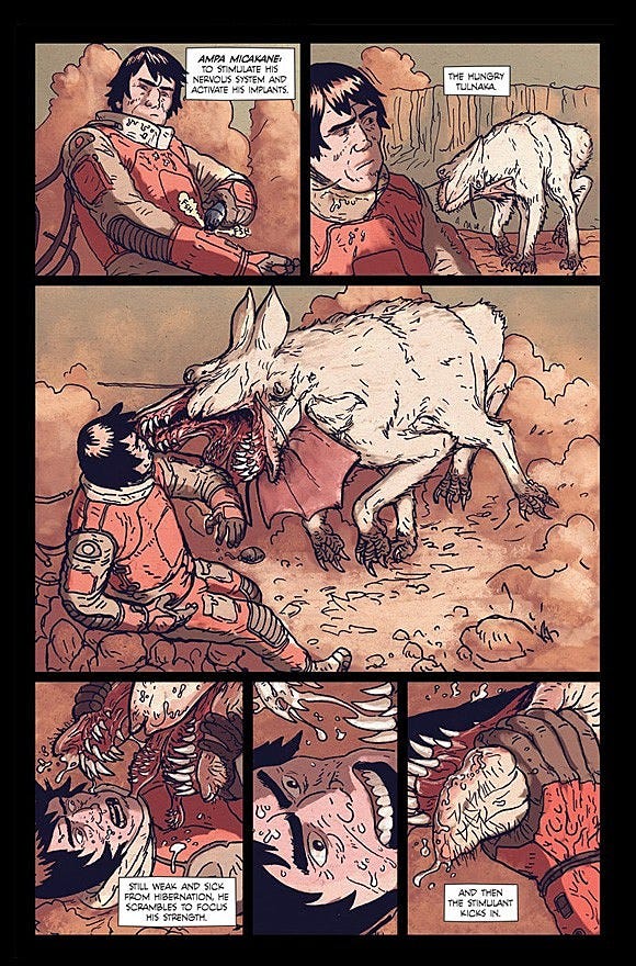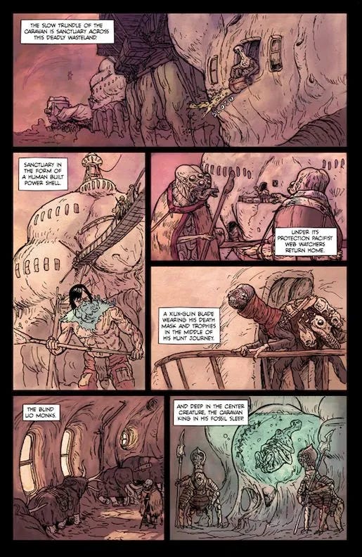 Both the ‘Activists Survival Guide’ and ‘Planet Furuha’ imagine whole alien worlds, with complex pseudo-natural evolutionary trees (slightly more pseudo in the case of Avatar) encountered by a future humanity. The Dragon Masters and Prophet both imagine war; alterations of man, and strange alien flesh across illimitable scales of time, while Predator: Badlands is ‘Scavengers Reign lite, and makes a scary planet for an xenos-teen to fight and understand, it also, ultimately these deep strange themes of war and human doom.