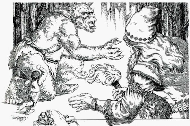 This is the story of an encounter with Tunnels and Trolls by a guy who did not know that much about Tunnels and Trolls and still doesn’t, so if you are a T&T maven and don’t want to hear some half-interested newb bang on, then stop reading now. (Also; they are bringing out a new version of this soon, and by god my post has nothing to do with it! I literally stapled together the rules that I used from ancient box-sets and a PDF, and I ignored most of them.)