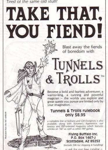 Thanks for this wonderful post! Like Akiyama, I ran T&T in the (early) 1980s when I was in junior high. We loved it, for all of those gonzo reasons, and because we didn't have a baseline for what was normal anyway, and because we were kids. I played many of the similarly weird T&T solo adventures, especially the glorious City of Terrors, and then used them as adventures for my campaign (2 players, my brother and a friend). I was marinating in Moorcock's Eternal Champion cycle paperbacks, and that was probably the biggest influence, along with Zork, all entirely in keeping with the T&T spirit.