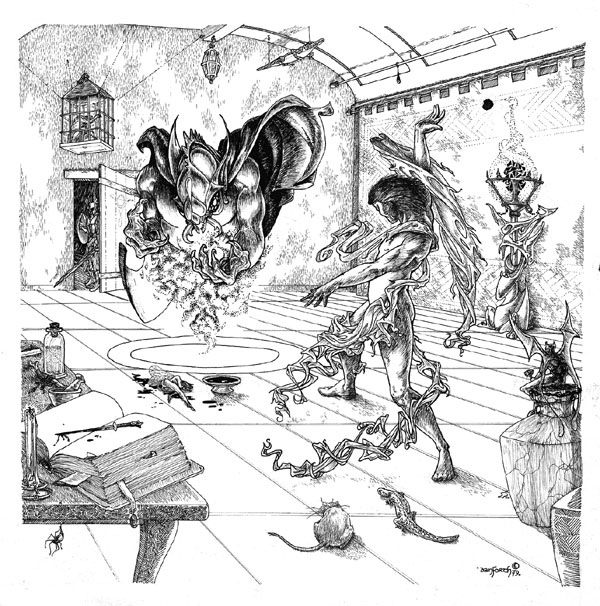Probably inspired by the ‘small’ and ‘large’ tables for character generation in 7.5, I included a shrinking rules in the dungeon. While I may have intended to use some complex coherent system based on alterations to the core stats, in fact I just eyeballed it, using patched together rule-ideas that were systemically inelegant but procedurally quick and functional; I made it up. T&T’s super-simple core stats make it easy to adapt things relatively quickly.